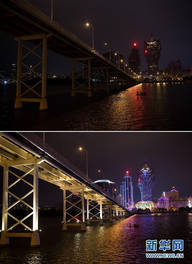 这是位于澳门的中国银行澳门分行大楼和周边酒店熄灯后(上图)和熄灯前(下图)的拼版照片(3月25日摄)。