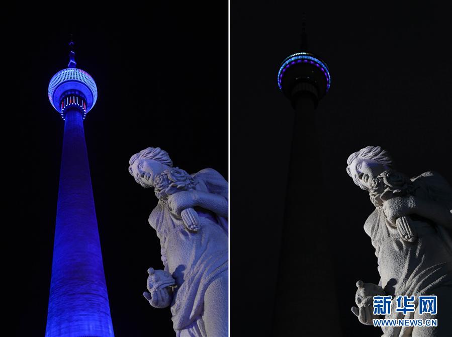 这是位于北京的中央电视塔熄灯前(左图)和熄灯后(右图)的拼版照片(3月25日摄)。