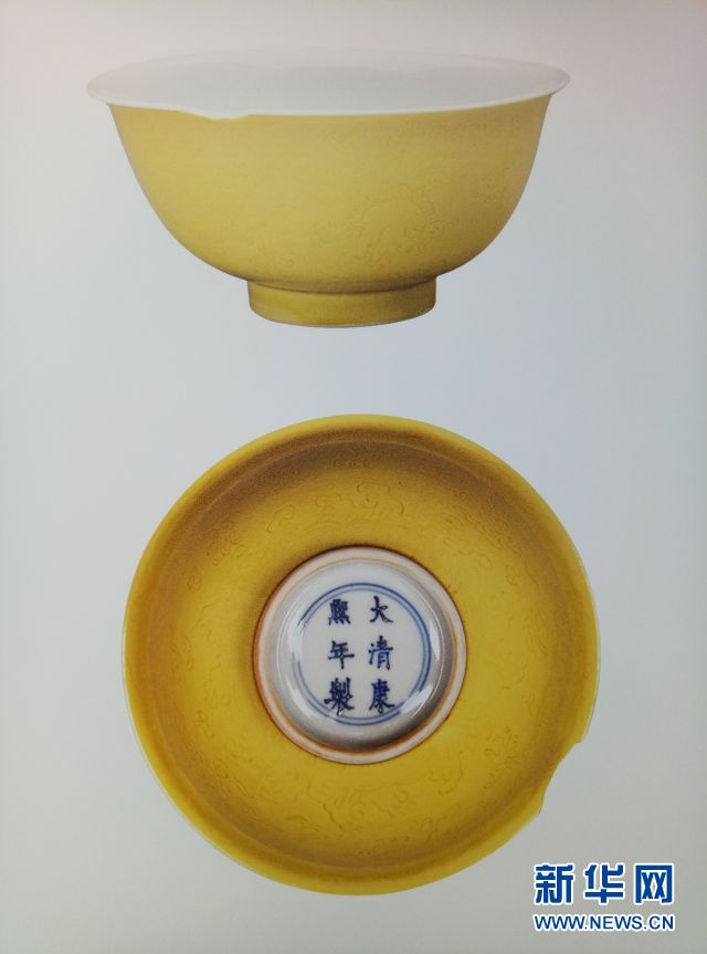 碗撇口,曲腹,圈足。碗里施白釉,光素无纹,外壁施黄釉,腹暗刻云龙纹,下刻海水江崖纹,纹饰刻划精细。外底署楷体“大清康熙年制”六字双行款,外围青花双圈。