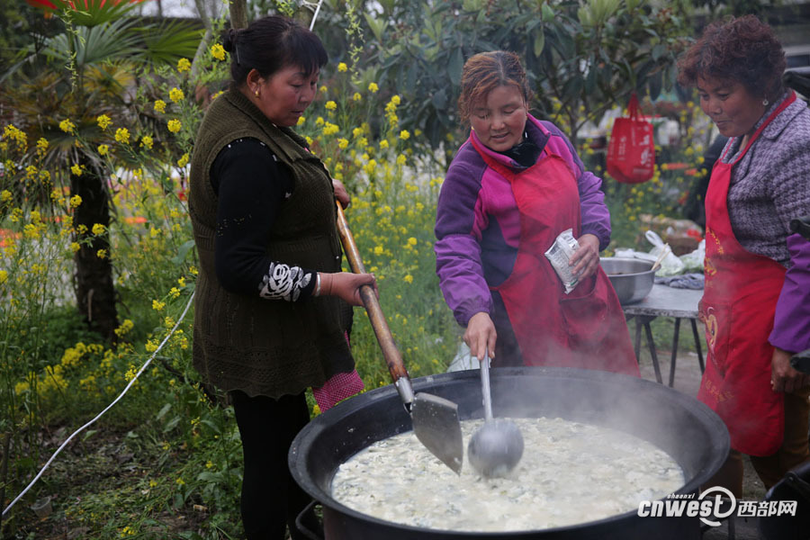 清明小长假陕南洋县农家院子里4口大铁锅做当地土席游客吃了都说好