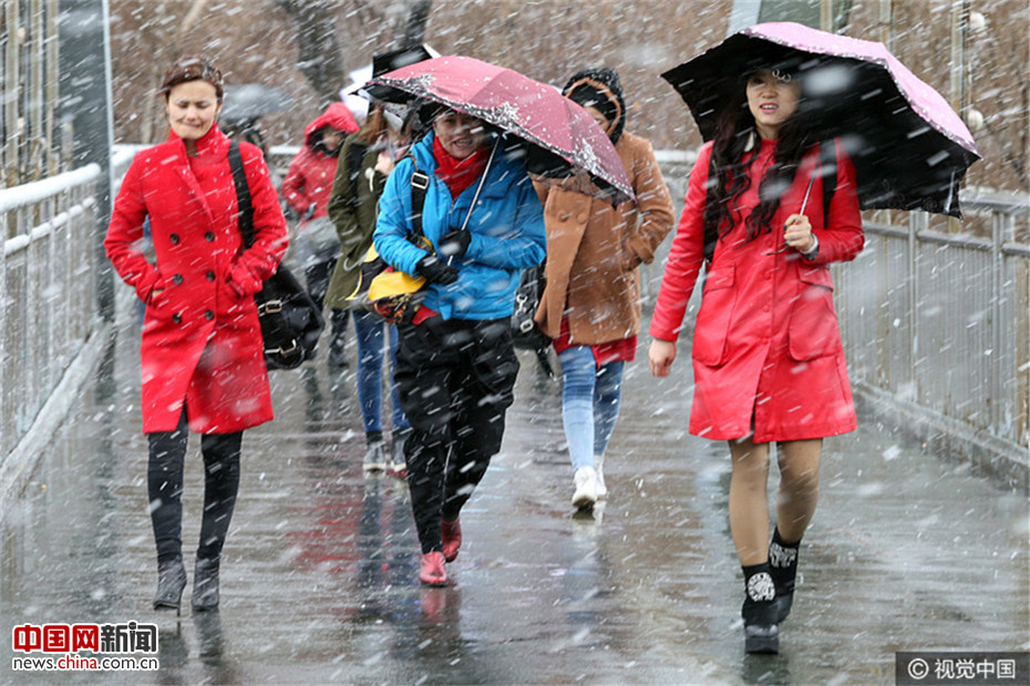 2017年4月2日,市民在乌鲁木齐小西门冒雪出行。当日是清明节假期,边城乌鲁木齐出现降雪天气。据中央气象台预报,4日08时至5日08时,新疆北部和西部山区、内蒙古东北部、黑龙江西北部等地的部分地区有小雪或雨夹雪;华北大部、黄淮、江淮、江汉、江南北部、西南地区东部和南部等地有小到中雨,其中,云南西北部、西藏东南部等地的局地有大雨(25~35毫米)。新疆北部、内蒙古东部、东北地区等地有4~6级风。
