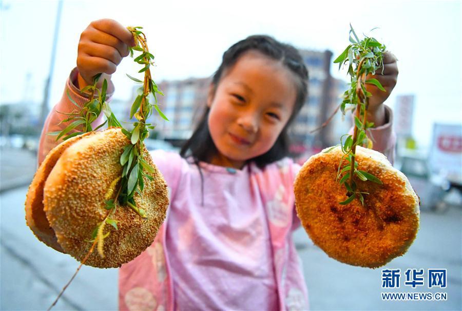 4月4日,在安徽省亳州市一烧饼摊前,一名小朋友展示“柳条串烧饼”。当日是农历二十四节气中的“清明”,按照安徽省亳州市民间习俗,清明节当天小孩要吃用柳条串着的烧饼,以防止小孩“苦夏”,即入夏后生病或食欲不振。新华社发(刘勤利摄)