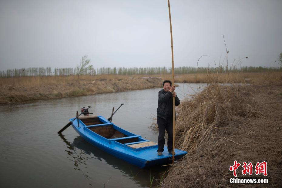 4月4日,河北省白洋淀岸边的安新县留通村村民杜锁良将小船停靠在岸边。中新社记者 刘关关 摄