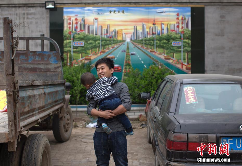 4月4日,白洋淀岸边的河北省保定市安新县大阳村,村民陈羽站在自己家的车和墙画前留影。