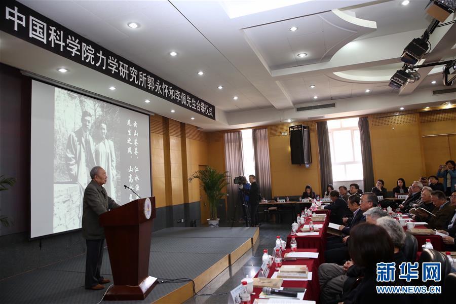 4月5日,郭永怀先生的学生俞鸿儒院士在郭永怀和李佩先生的纪念大会上发言。当日,中国科学院力学研究所在北京举行郭永怀与李佩先生合葬仪式。力学所原副所长、“两弹一星”元勋郭永怀先生1968年因飞机失事不幸牺牲,骨灰于1988年被迁回力学所,葬于主楼前的苍松翠柏之下。2017年1月12日,?郭永怀先生夫人、我国著名应用语言学家、中国科学院大学教授、被称为“中科院最美玫瑰”的李佩先生在北京去世。根据李佩先生本人及家属意愿,力学所将二人骨灰合葬在郭永怀塑像下。新华社记者金立旺 摄