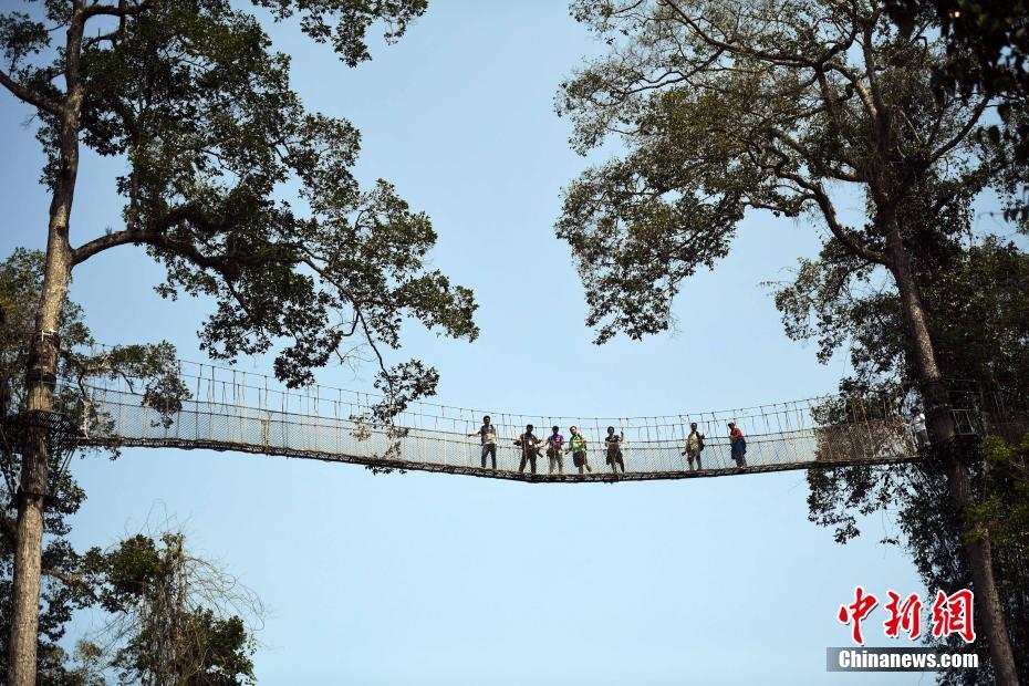 4月5日,游客体验空中树冠走廊。云南省西双版纳傣族自治州勐腊县境内的望天树景区,生长着一种高达80米的常绿高大乔木,热带雨林的标志性树种“雨林巨人”——望天树。望天树36米高的树冠中设空中走廊,吸引众多民众前来体验。中新社记者 李进红 摄