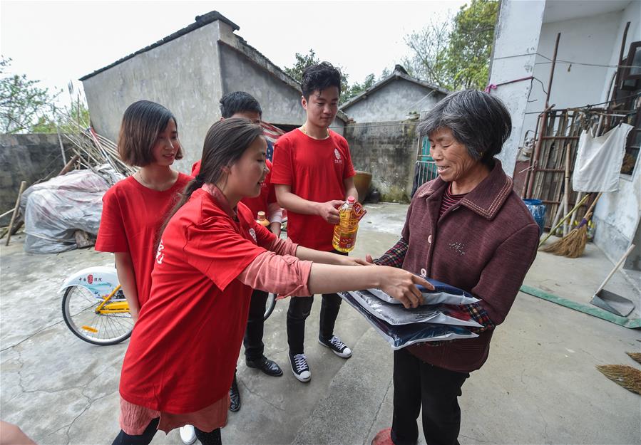 4月5日,新港村志愿者骑行队的成员给贫困户毕莲英(右一)送上衣服、食用油等慰问品。 2017年初,浙江省桐乡市濮院镇新港村建立志愿者骑行队,青年志愿者通过自行车骑行这一便捷的方式,定期走访各个乡村,开展治安巡防、卫生监督、文明劝导、五水共治、助老扶残等志愿服务活动,为加强美丽乡村道德文化建设、文明乡风建设贡献自己的一份力。新华社记者 徐昱 摄