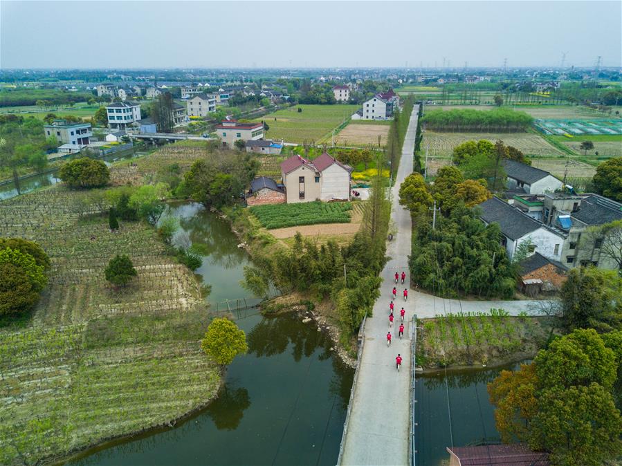 4月5日,新港村志愿者骑行队的成员骑行在村道上。 2017年初,浙江省桐乡市濮院镇新港村建立志愿者骑行队,青年志愿者通过自行车骑行这一便捷的方式,定期走访各个乡村,开展治安巡防、卫生监督、文明劝导、五水共治、助老扶残等志愿服务活动,为加强美丽乡村道德文化建设、文明乡风建设贡献自己的一份力。新华社记者 徐昱 摄