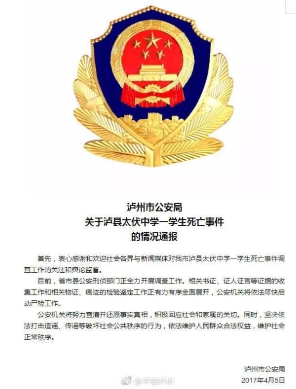 4月5日20点,泸州市公安局官方微博发布关于泸县太伏中学一学生死亡事件的情况通报,通报感谢社会各界对泸县太伏中学一学生死亡事件调查工作的关注和舆论监督,同时表示省市县公安刑侦部门正全力开展调查工作。