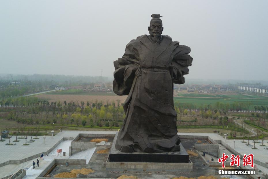 4月7日,航拍徐州丰县赵庄镇刘寨村汉皇祖陵,高达42.6米的刘邦铜像气势磅礴,再现了这名千古帝王的雄风。汉皇祖陵是以汉高祖刘邦的曾祖父、刘姓大始祖刘清墓为中心扩展而成的一座陵园陈列馆。中新社记者 泱波 摄