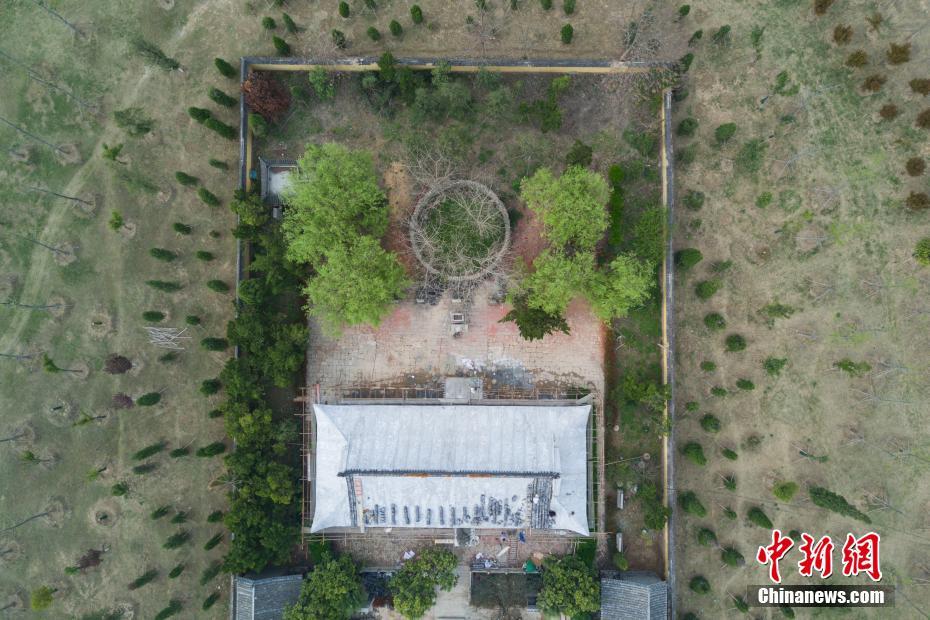 4月7日,航拍徐州丰县赵庄镇刘寨村汉皇祖陵,高达42.6米的刘邦铜像气势磅礴,再现了这名千古帝王的雄风。汉皇祖陵是以汉高祖刘邦的曾祖父、刘姓大始祖刘清墓为中心扩展而成的一座陵园陈列馆。中新社记者 泱波 摄