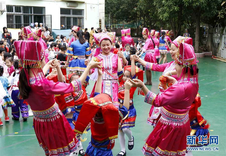 4月7日,南宁市第四幼儿园的老师和孩子们在跳民族舞蹈。当日,广西南宁市第四幼儿园举行“民族文化教育”主题活动,小朋友们身着壮、瑶、苗等民族服饰唱歌起舞,接受民族传统文化的熏陶。新华社记者 张爱林 摄