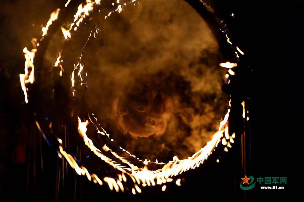 功勋犬夜训跳火圈 满满大片即视感