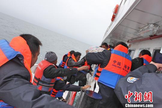图为救援人员将僧尼转运至安全性更高的游轮 冯璟 摄