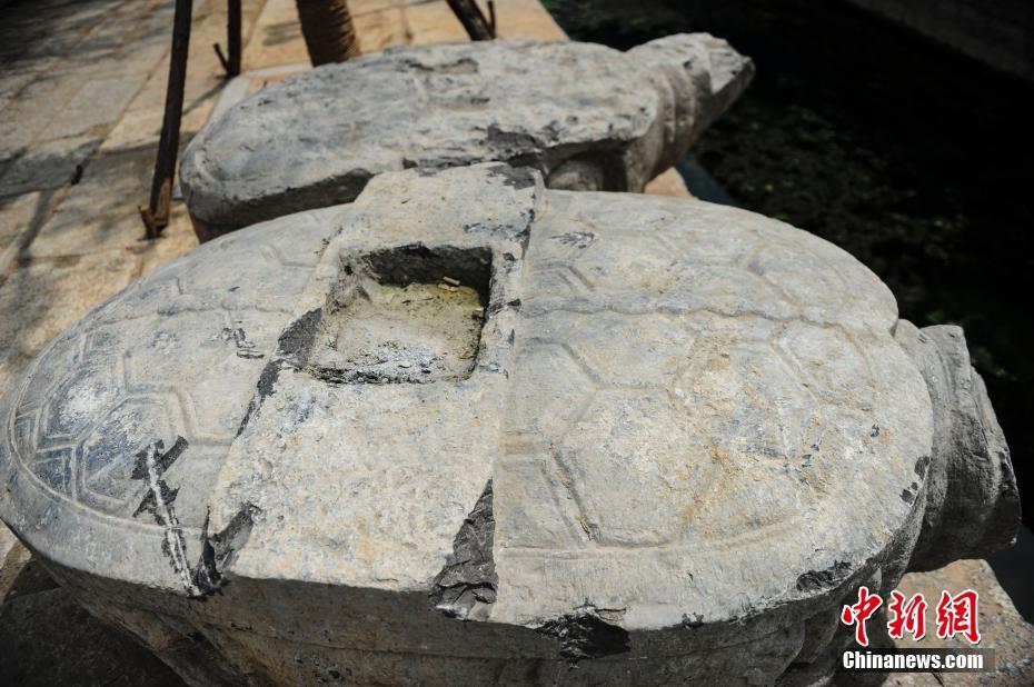 4月11日,在山东济南明府城百花洲整治工程施工中,发现一处明代“泰山行宫”遗址(又称碧霞宫)。考古人员发掘清理出房址5座、碑额2通、石雕赑屃2只及少量瓷片、建筑构件。图为山东济南明代“泰山行宫”遗址出土的赑屃。中新社记者 张勇 摄