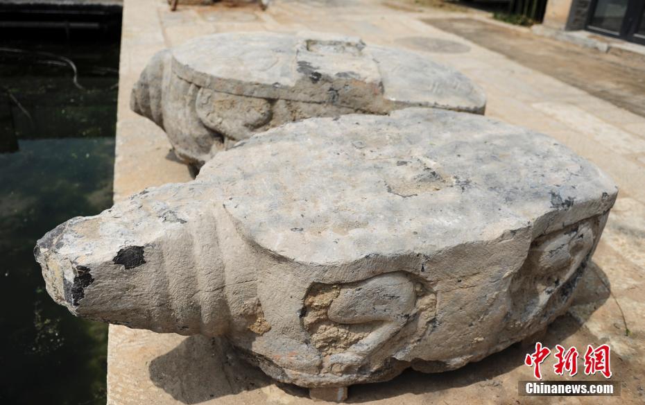 4月11日,在山东济南明府城百花洲整治工程施工中,发现一处明代“泰山行宫”遗址(又称碧霞宫)。考古人员发掘清理出房址5座、碑额2通、石雕赑屃2只及少量瓷片、建筑构件。图为山东济南明代“泰山行宫”遗址出土的赑屃。中新社记者 张勇 摄