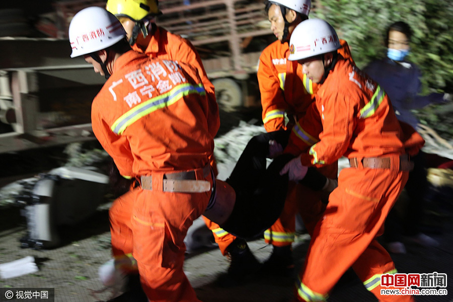 2017年4月10日,南宁市消防支队指挥中心接到报警:南宁市江南区绕城高速高岭收费站往玉洞方向1公里处发生交通事故,有多人被困。图为救援现场。e分子/视觉中国