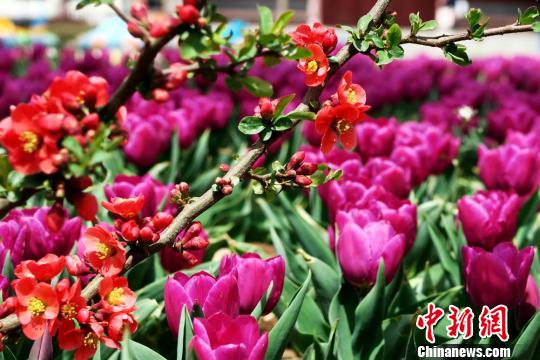郁金香与梅花争奇斗艳。郭红 摄