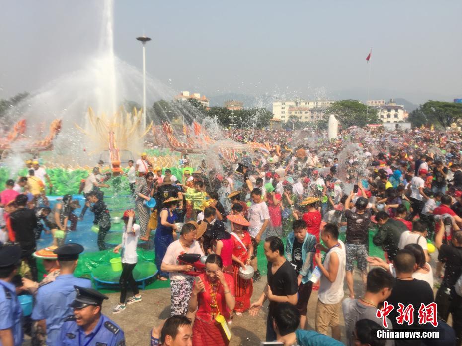 “太热闹了。”来自山东的张琳一家与好友相约来到德宏参加泼水节。“全城酒店都满房了,最后只能住在朋友家里,第一次参加泼水节,非常开心。”张琳到达芒市广场时浑身已经湿透,拿着小水桶与大家相互以水传递祝福。崔汶 摄