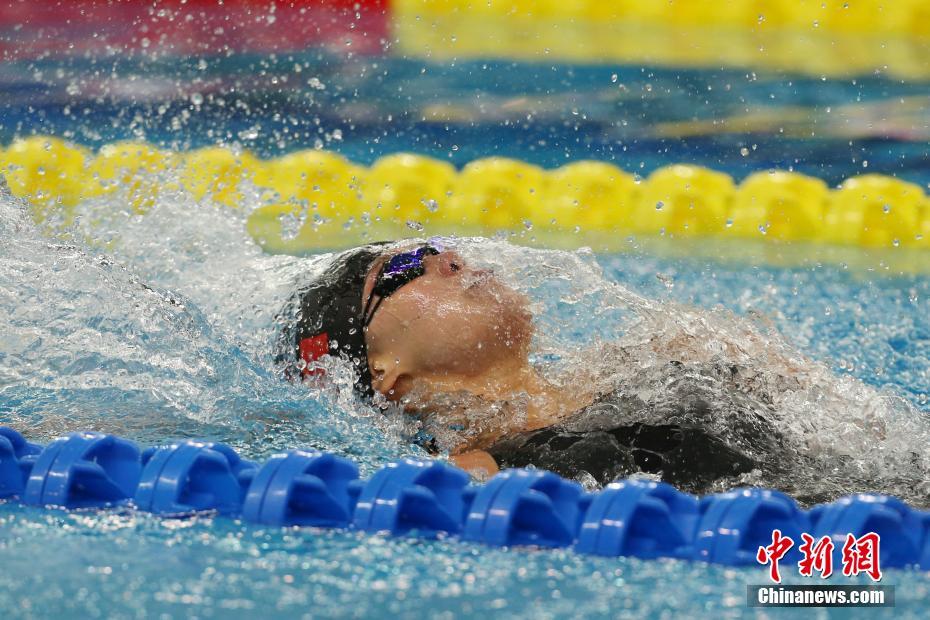 4月12日,傅园慧在比赛中。当日,在山东青岛进行的2017年全国游泳冠军赛暨第十三届全运会预选赛女子100米仰泳决赛中,浙江选手傅园慧以58秒72的成绩夺冠,并打破由她自己创下的该项目全国纪录。中新社记者 韩海丹 摄