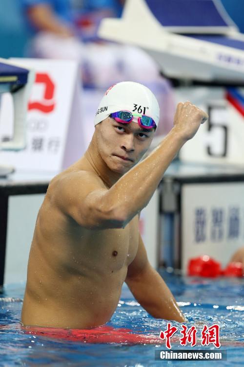 4月12日,浙江选手孙杨在男子200米自由泳决赛后庆祝。当日,在山东青岛进行的2017年全国游泳冠军赛暨第十三届全运会预选赛男子200米自由泳决赛中,浙江选手孙杨以1分44秒91的成绩夺冠。中新社记者 韩海丹 摄