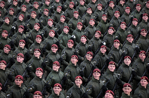 当地时间4月12日,俄罗斯在莫斯科近郊的阿拉比诺靶场举行胜利日阅兵式彩排。图为徒步方队。(网页截图)