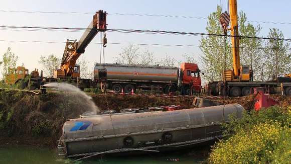 15时50分,泄露点堵漏完毕。由于地势较低罐体较重,吊车无法将其吊正,经与现场技术人员协商后决定,分两次倒罐转移剩余柴油,首先利用第一次倒罐减轻罐车一部分重量,保证吊车能够将其吊正,随后,进行第二次倒罐,将剩余柴油全部转移后,将罐车吊上拖车。