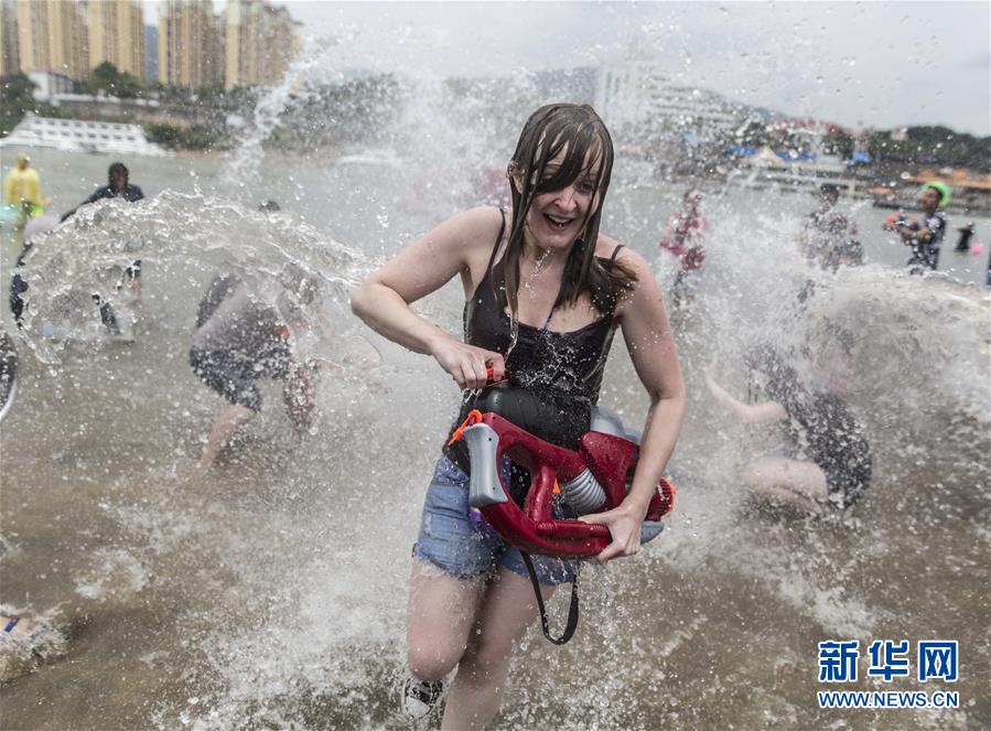 4月15日,一名外国游客在西双版纳景洪泼水广场参加泼水狂欢。