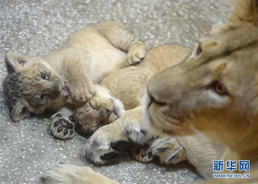 4月12日,在俄罗斯叶卡捷琳堡动物园,两只新出生的非洲狮幼崽与妈妈在一起。 新华社/卫星社