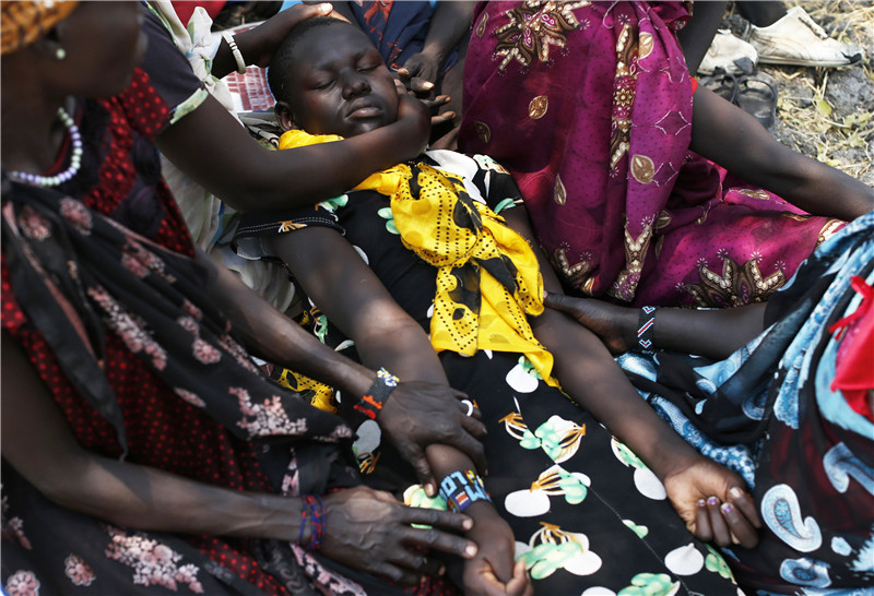 在塔克的无国界医生户外支持诊所排队区,亲属们在候诊期间安慰一位生病的妇女。中午时分,当地气温超过35摄氏度,并且极度干燥,风吹在肌肤的感觉有如被火烧一般。
