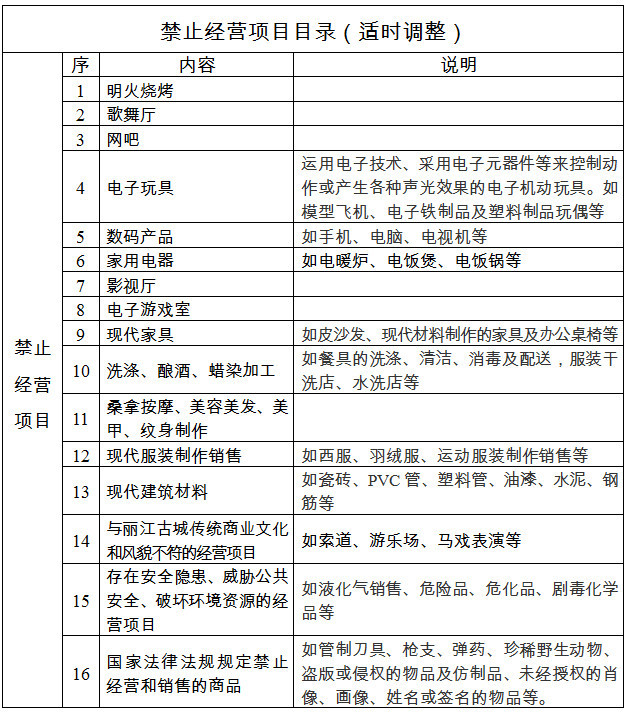 禁止经营项目是指与遗产风貌保护、丽江古城传统商业文化不符,以及存在安全隐患、国家明令禁止经营的经营项目。