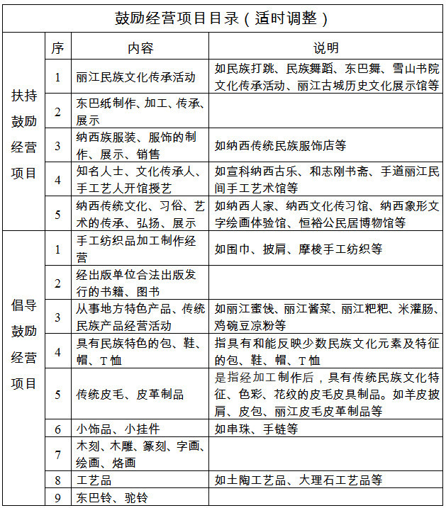 鼓励经营项目是丽江古城文化遗产保护的重要内容,通过实物、图片、音像、表演等形式对民族文化进行宣传和介绍,以及传统手工艺制品、地方特色产品和传统民族产品的加工、制作及销售等。