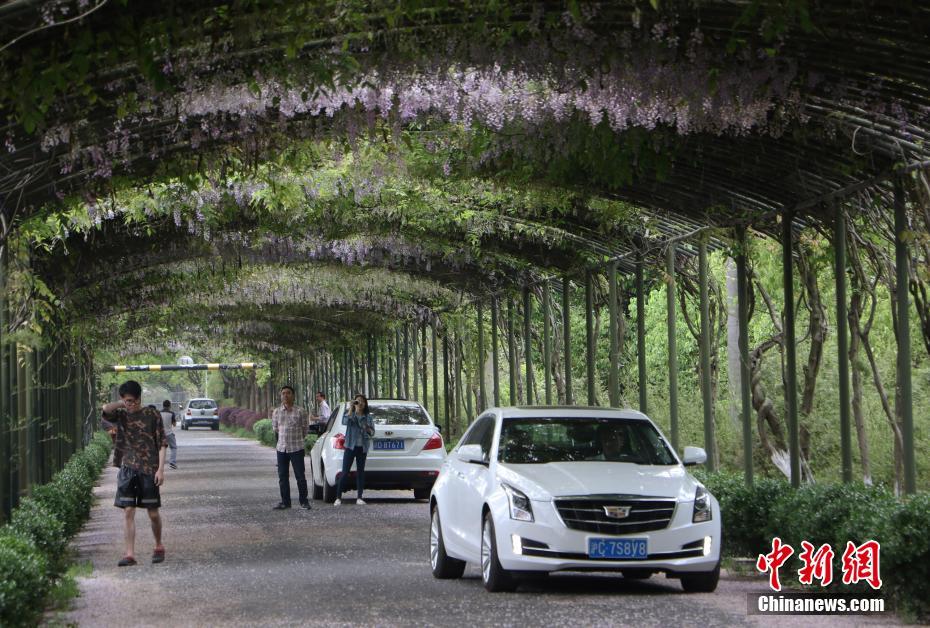 4月19日,浙江杭州“紫藤花大道”引得市民驱车前来体验。近日,杭州紫藤路上紫藤花绚丽绽放,花团锦簇,如梦似幻,不少市民游客纷纷到此观赏体验。中新社记者王刚 摄