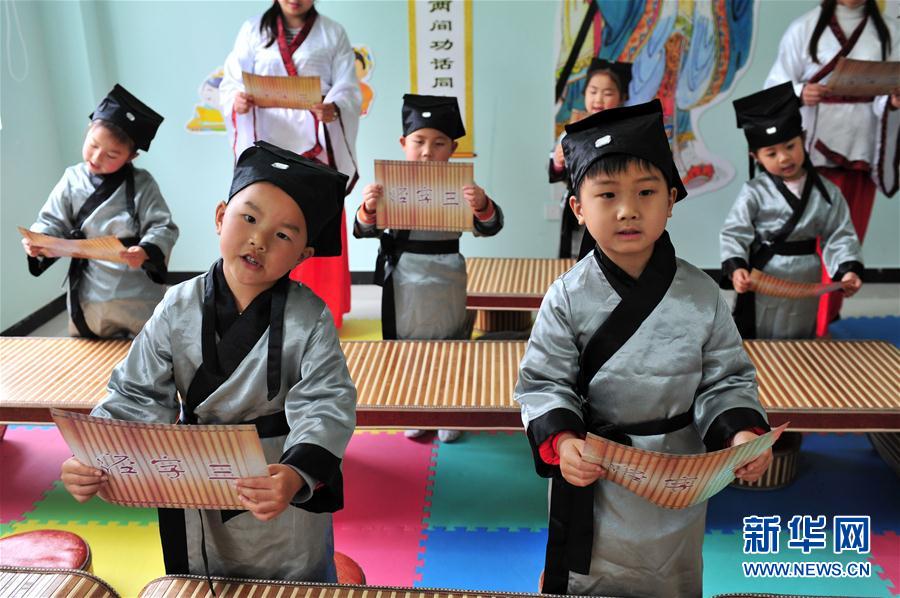4月21日,湖北省秭归县九里幼儿园的孩子们诵读《三字经》。
