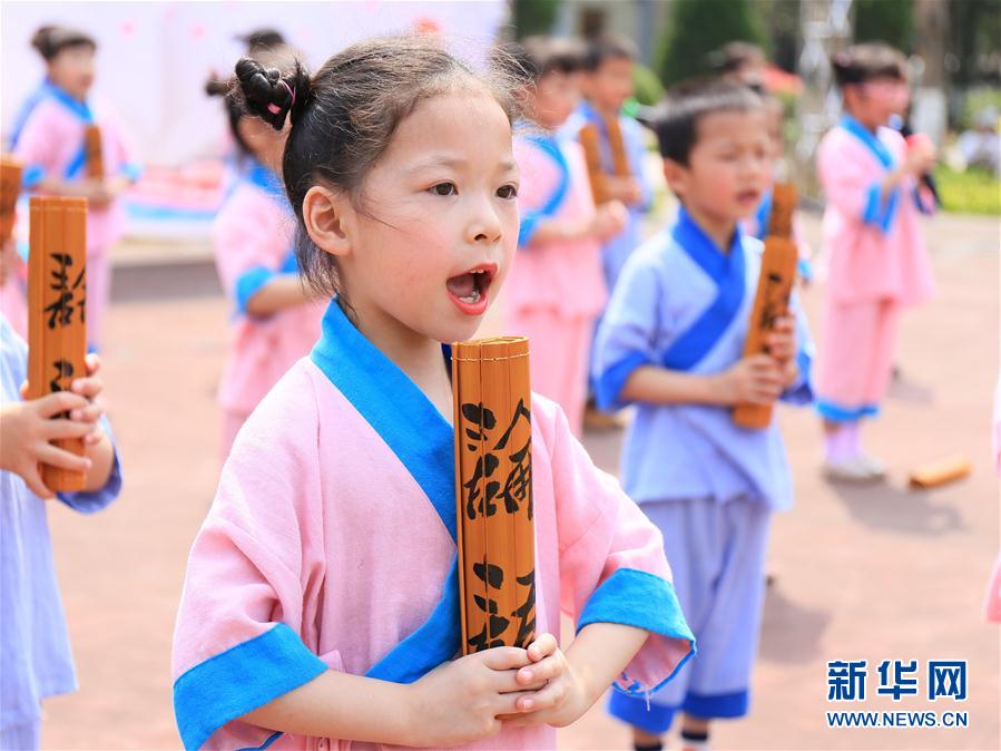 4月20日,在广西武宣县城文化广场,小朋友诵读《论语》。