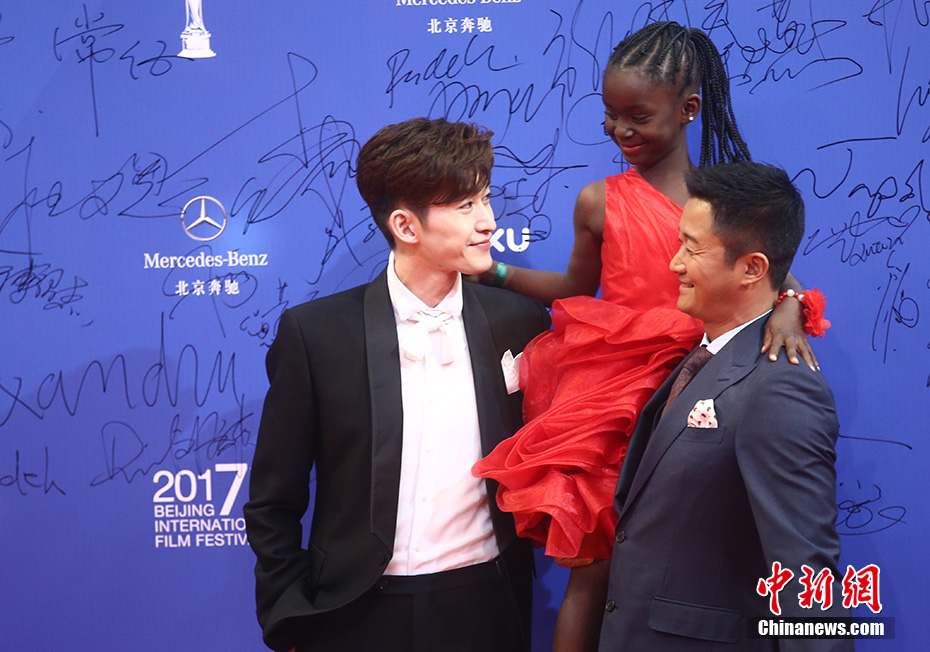 4月23日,第七届北京国际电影节在北京怀柔区国家中影数字制作基地闭幕。官方四大女神林志玲、莫妮卡贝鲁奇、铃木保奈美、蒋雯丽红毯斗艳。图为吴京张翰代表《战狼2》一同现身面带微笑,两个人更是手臂对手臂将来自非洲的小朋友托举起来。中新网记者 金硕 摄