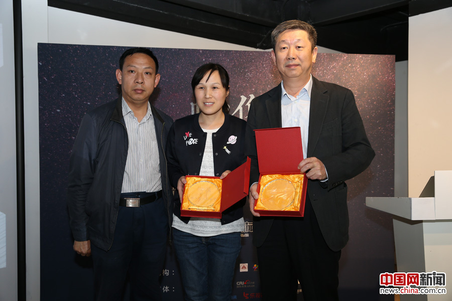 北京市民政局新闻处冀昕宇为中国文联中华经典系列咏诵组委会创作室副主任张晓平和星星雨教育机构发展部主任王培培颁发《帧像》“最有意义的故事奖”。中国网记者 陈维松 摄