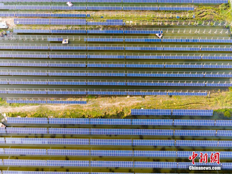 4月23日,航拍正在建设的江西都昌县矶山湖“渔光一体”光伏电站。连日来,位于鄱阳湖畔的江西都昌县矶山湖“渔光一体”光伏项目加紧安装,预计今年5月份可建成投产。目前,太阳能光伏板安装完成70%。该项目装机容量80MW,总投资6.4亿元,利用矶山湖水产场部分保水保肥能力差的沙质鱼池,架设光伏板进行光伏发电,实行水上发电,水下养鱼的模式,提高水面资源的利用效率。傅建斌 摄