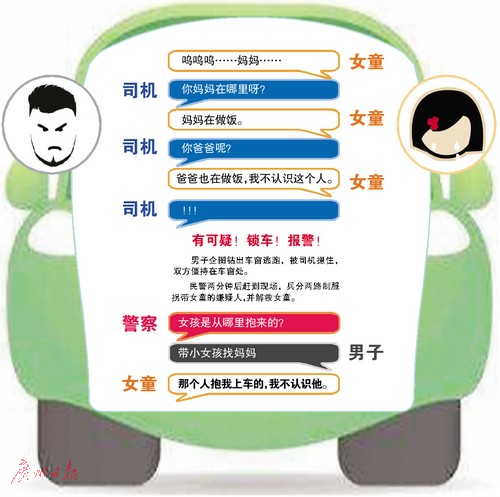“小女孩讲话清晰,对身边男子的态度也让人怀疑。”秦师傅警觉起来,他说,当时意识到可能遇到了拐骗孩子的事件,眼见来到一红绿灯路口,他知道嶂背警务室就在不远处,于是快速下车,机智地将车门反锁,然后拿起电话报警。