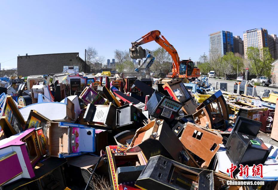 4月24日,新疆乌鲁木齐市集中销毁27万余件侵权盗版、非法出版物及非法游戏游艺设施。据介绍,此次共集中销毁的非法出版物包括未经批准印刷的内部资料、非法医疗小册子,盗版光碟等。其中非法图书15万余册,非法音像制品及盗版软件12万余张,非法游戏机2370台。图为大型挖掘机碾压非法游戏游艺设施。中新社记者 刘新 摄
