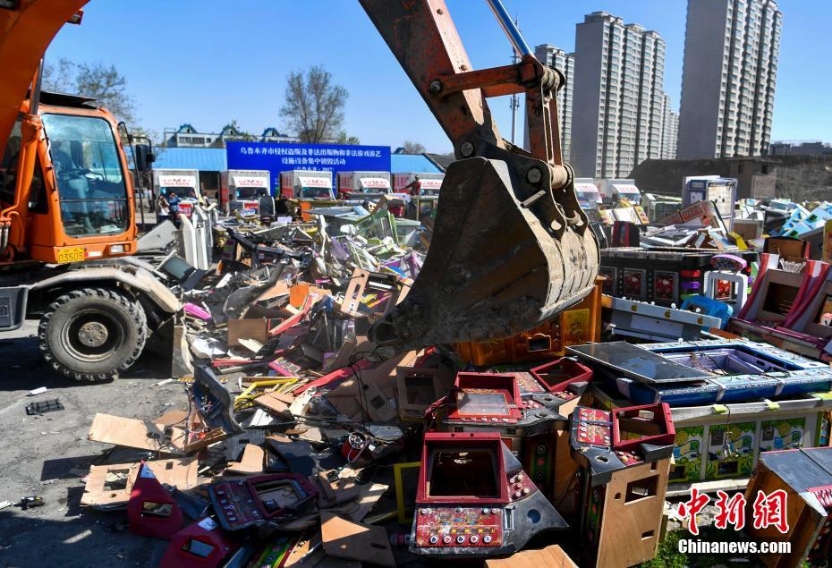 4月24日,新疆乌鲁木齐市集中销毁27万余件侵权盗版、非法出版物及非法游戏游艺设施。据介绍,此次共集中销毁的非法出版物包括未经批准印刷的内部资料、非法医疗小册子,盗版光碟等。其中非法图书15万余册,非法音像制品及盗版软件12万余张,非法游戏机2370台。图为大型挖掘机碾压非法游戏游艺设施。中新社记者 刘新 摄