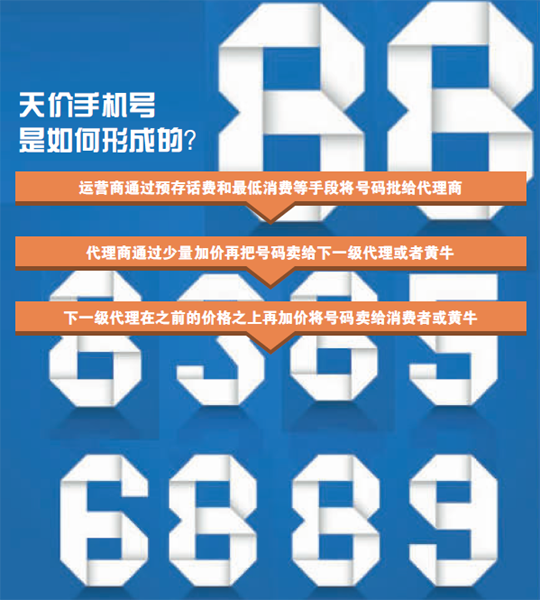 资深通信专家项立刚指出,手机靓号的利益链条大致分为三个环节:运营商通过预存话费和最低消费等手段将号码批给代理商,代理商通过少量加价再把号码卖给下一级代理或者黄牛,下一级代理在之前的价格之上再加价将号码卖给消费者或黄牛。每转手一次,价格就在原来基础上增加一些,转手越多,最后到用户手里的价格越高。