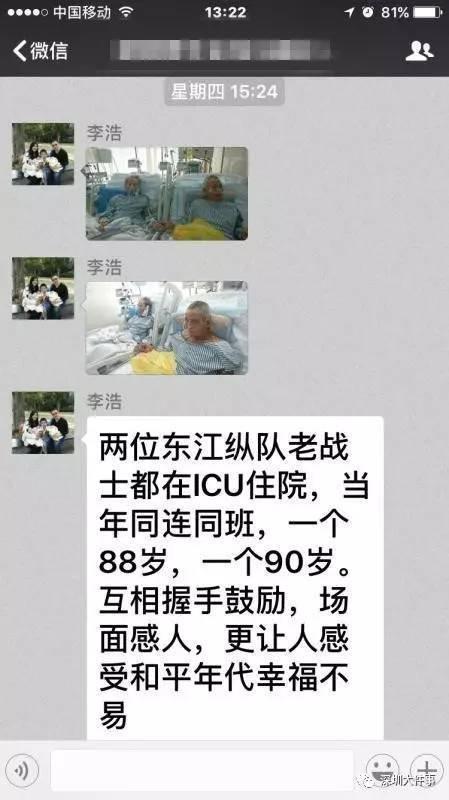 两位老人病房相逢并相互鼓励的照片在中大八院微信群里不胫而走,引发医护人员强烈反响,人们争相留言,表达敬意和祝福。