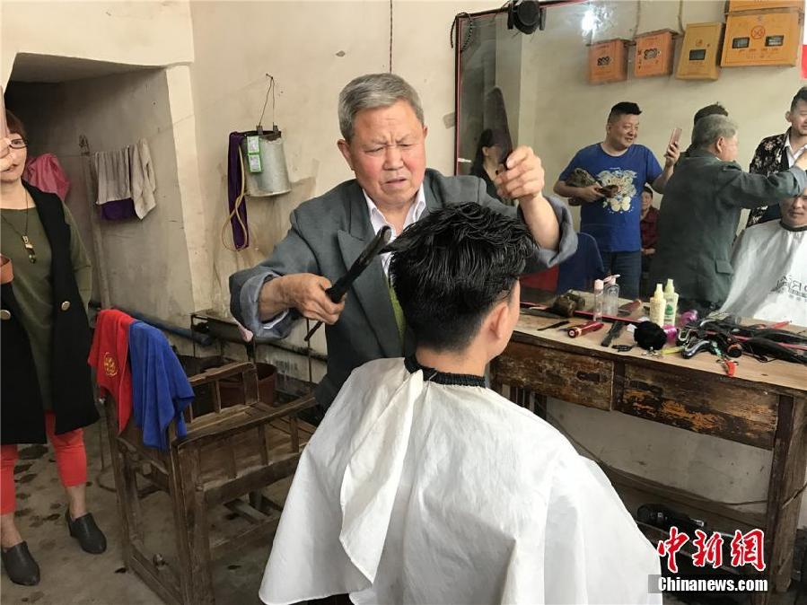 近日,一段理发师火钳烫发的视频引起网友普遍关注,主角还是一位74岁的老大爷。4月25日,记者来到四川绵阳市三台县金石镇,亲眼见证上世纪80年代非常流行的一种烫发方式,火钳烫发。杨勇摄