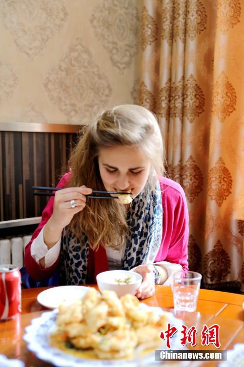 来自法国的27岁女孩安娜从高中开始学习汉语;后来,她来到中国读研学习中医学相关专业,两年多的深造让安娜越发迷恋博大精深的中医和中国传统文化。安娜说:“中医在欧洲已获得广泛的认可,在我的家乡法国里昂现在也开了很多中医馆,我希望把在中国学到的医技带回家,再尝试跟中国的中医机构进行合作,将来也开一家自己的中医馆。”图为安娜在饭店吃她最喜欢的中国菜锅包肉。中新社记者 王舒 摄