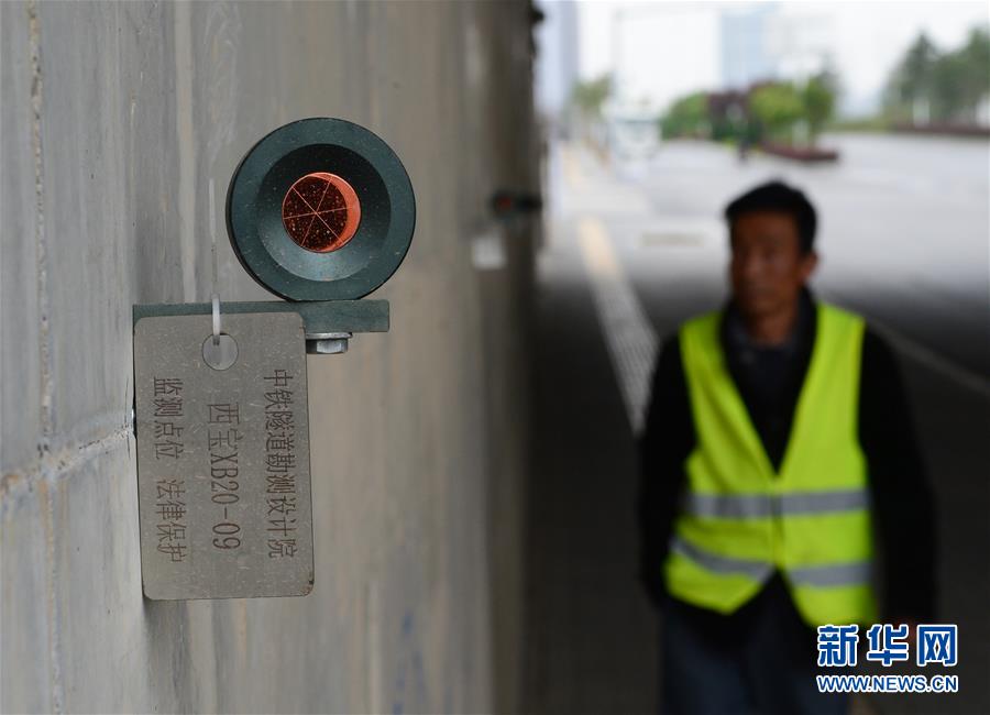 4月26日,工人对安装在西宝高铁涵洞内的沉降监测点位进行巡护。