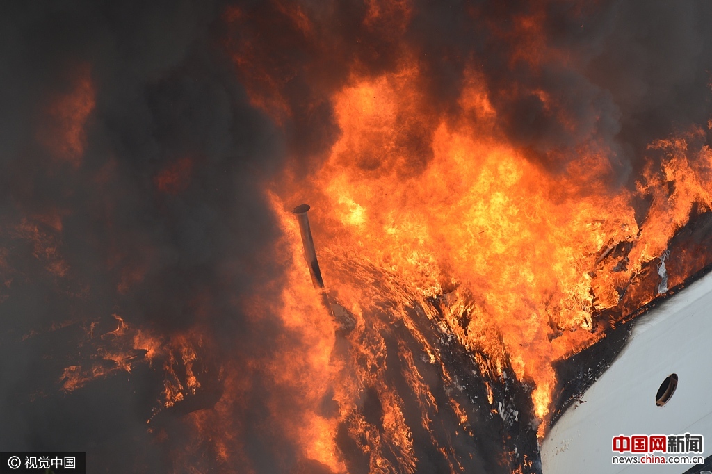 2017年4月27日,长沙市湘江中路竹山园附近一船体模型建筑发生火灾,据现场目击者称,火情迅速蔓延整个船体,浓烟滚滚。马鑫/视觉中国
