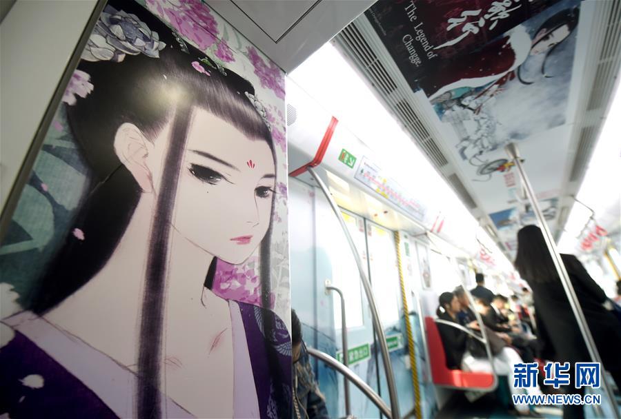画家夏达创作的漫画作品《长歌行》里的卡通形象出现在地铁车厢里(4月27日摄)。新华社记者 王定昶 摄