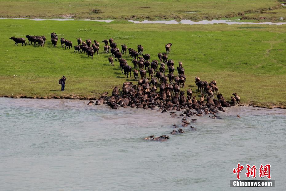 4月28日,四川南充蓬安县相如镇油房沟村第八届嘉陵江放牛节开幕,吸引近万名游客观赏。蓬安每年4月至10月,每天都能观赏到百余头水牛日出横渡嘉陵江上岛吃草、日落从小岛游回依次归栏的生态奇观,当地老百姓称之为“百牛渡江”。中新社记者 王爵 摄