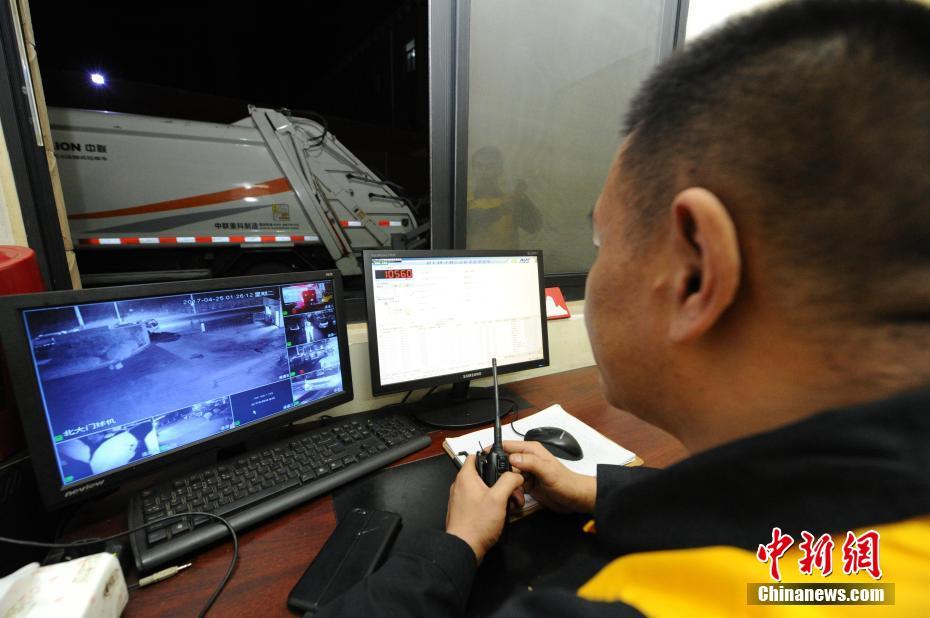 中控室内,中控员调度垃圾清运车进场倾倒,又指挥大型转运车将密封箱的垃圾转运至焚烧厂。 中新社记者 张娅子 摄